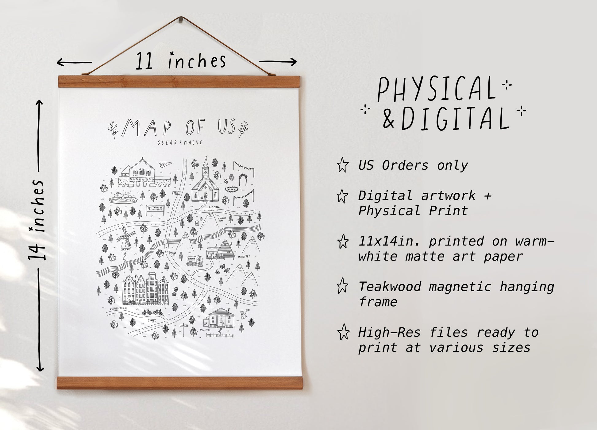 • Physical Prints are 11x14in. printed on warm-white matte art paper. You will also receive a Magnetic Teakwood Hanging Frame, as pictured, as well as the Digital Files.